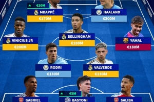 中场/边锋:罗德里(曼城,1.3亿欧)、巴尔韦德(皇马,1.3亿欧)、维尼修斯(皇马,2亿欧)、贝林厄姆(皇马,1.8亿欧)、亚马尔(巴萨,1.8亿欧)